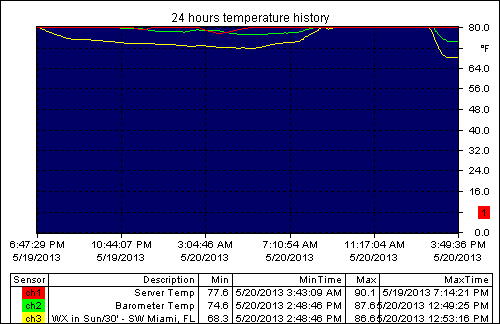 | WX in Sun/30' - SW Miami, FL | 68.3°F | 86.6°F | 68.3°F | (°C) | | Barometer Temp | 74.6°F | 87.6°F | 74.6°F | (°C) | | Server Temp | 87.6°F | 87.8°F | 77.6°F | (°C) | | Dewpoint (graph) | 74.6°F | | | |
